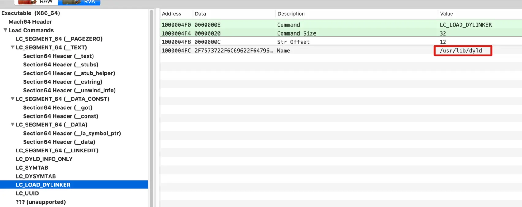 该加载命令包含了重要的程序启动动态链接器的路径,如下图x86_64的为/usr/lib/dyld。