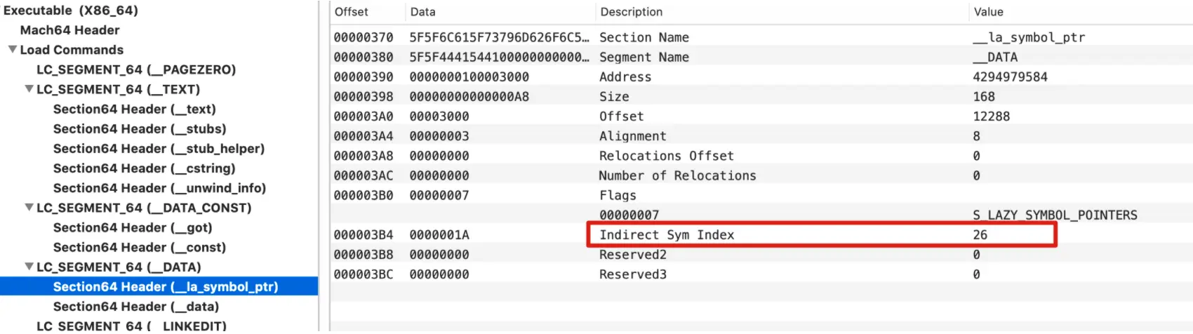 _la_symbol_ptr中的符号在间接符号表中的起始条目序号为26。