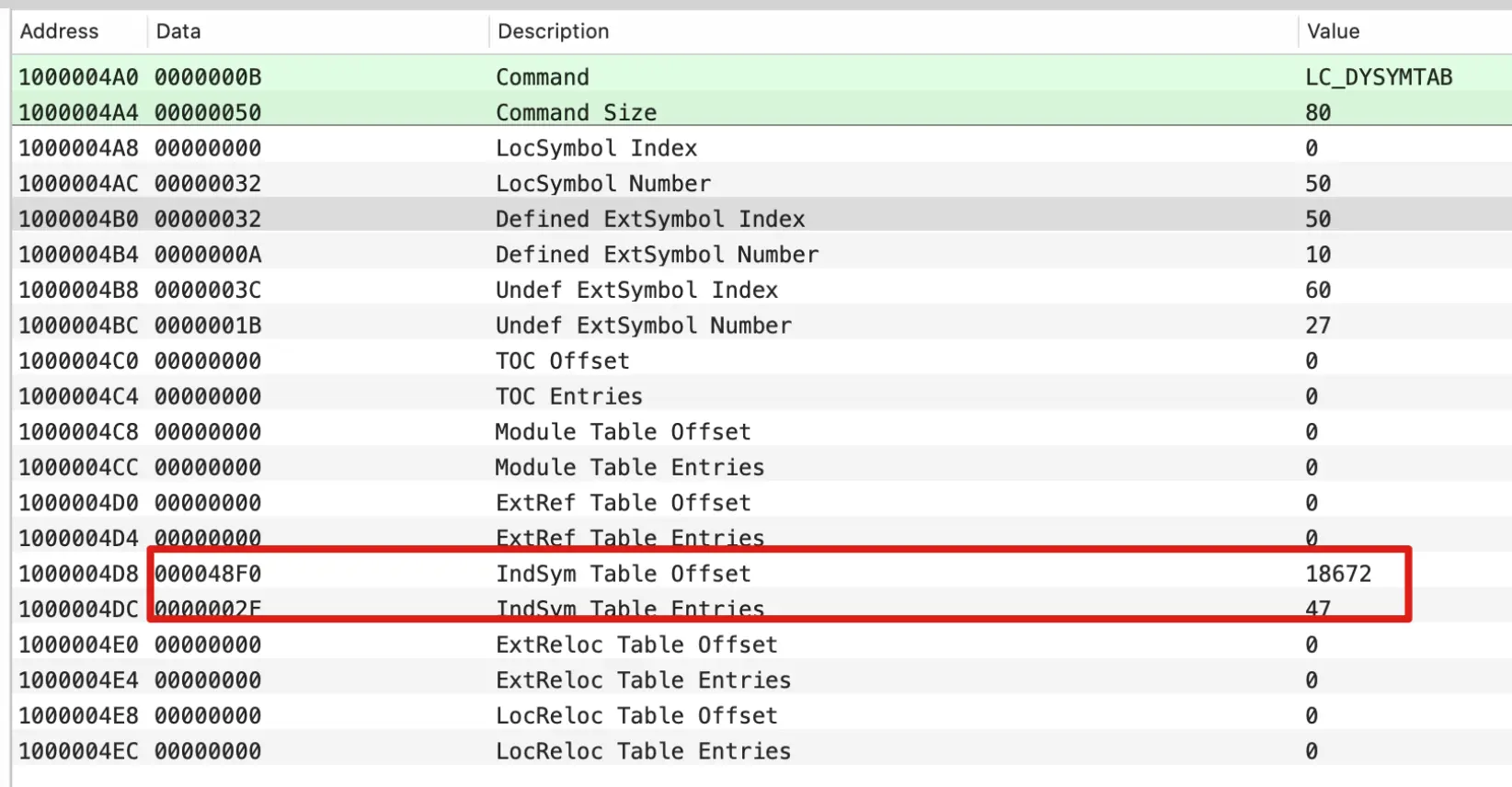 对于Dynamic Symbol Table中的Indirect Symbols其内容为一个表,每个条目的内容为其在Symbol Table中的序号,如下图: