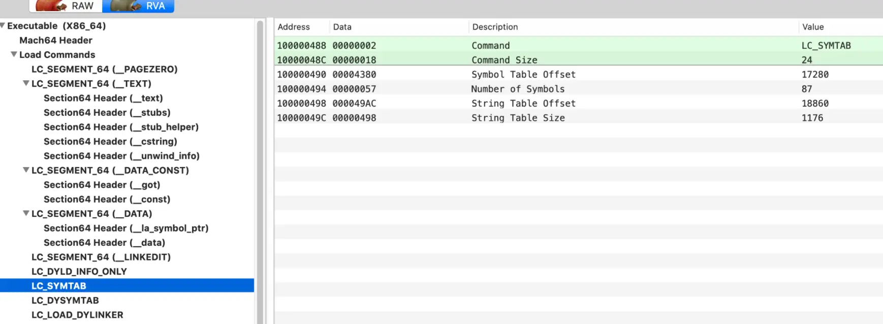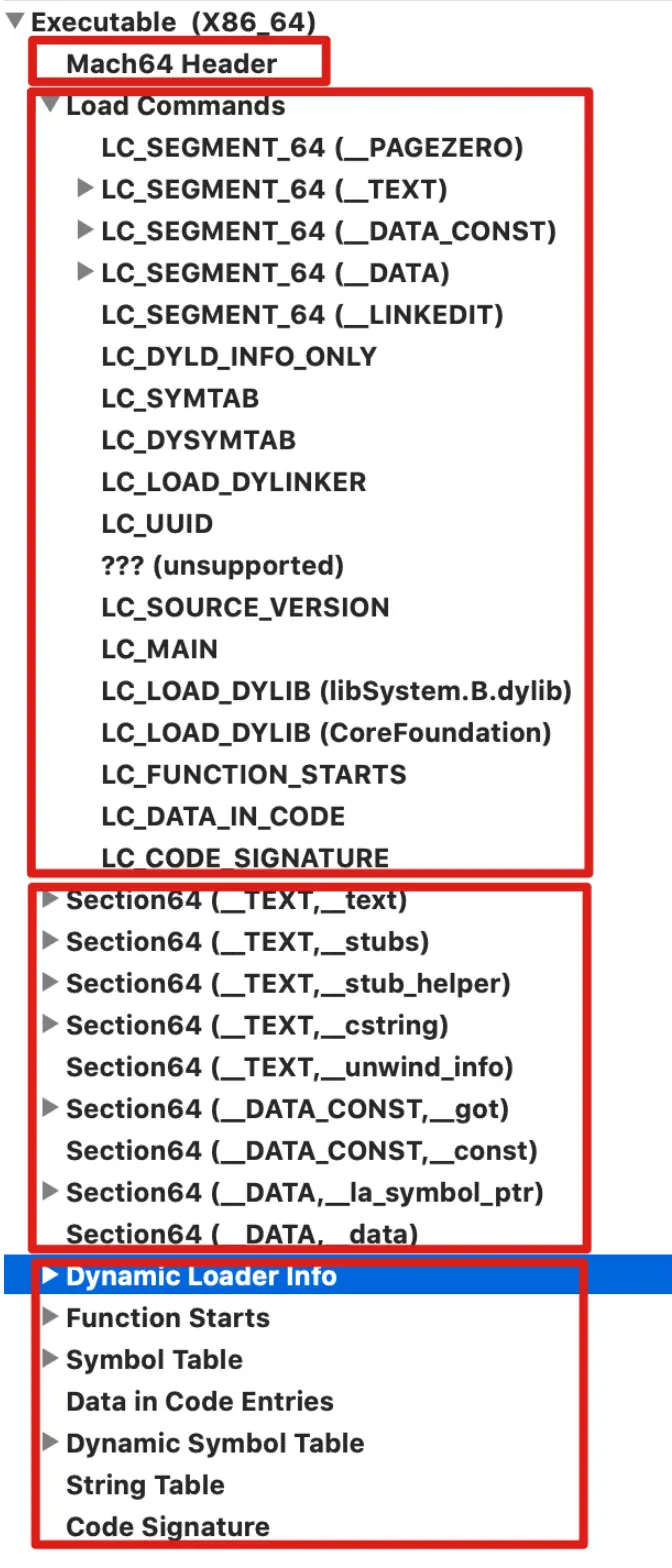 Loader info链接信息及其他文件末端包含了一系列链接信息,如动态链接器用来链接可执行文件或者依赖所需使用的符号表、字符串表等,以及签名信息等;