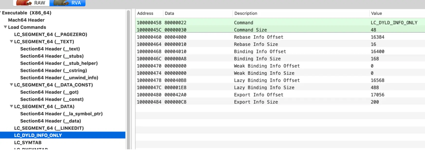 由于地址空间随机化技术(ddress space layout randomization, ASLR)和地址无关可执行技术(position-indendent excutable, PIE),使得程序在内存的加载地址是随机的,因此需要程序在动态链接阶段将内部地址进行修正。Rebase 数据描述了哪些是对指向 MachO 内部的引用并将其修正,而 Bind 数据描述哪些是指向外部的引用并进行修正。Lazy Bind 数据描述了哪些符号需要延迟绑定,即仅在第一次使用时才会绑定,不会在启动时进行,提高启动效率;Export数据描述了对外可见的符号。其内容都是以操作数(Opcodes)、立即数(immediate)以及采用uleb128/sleb128编码的偏移值组成。