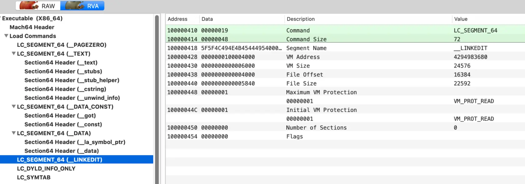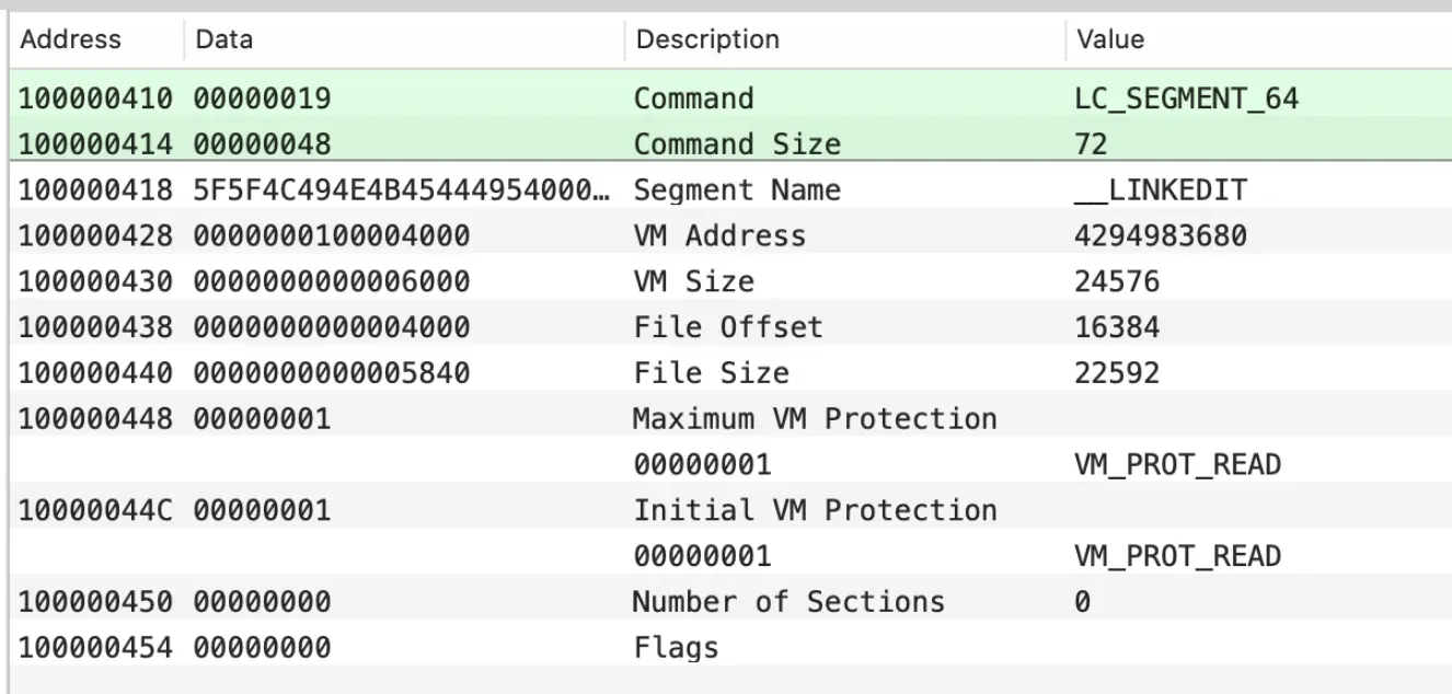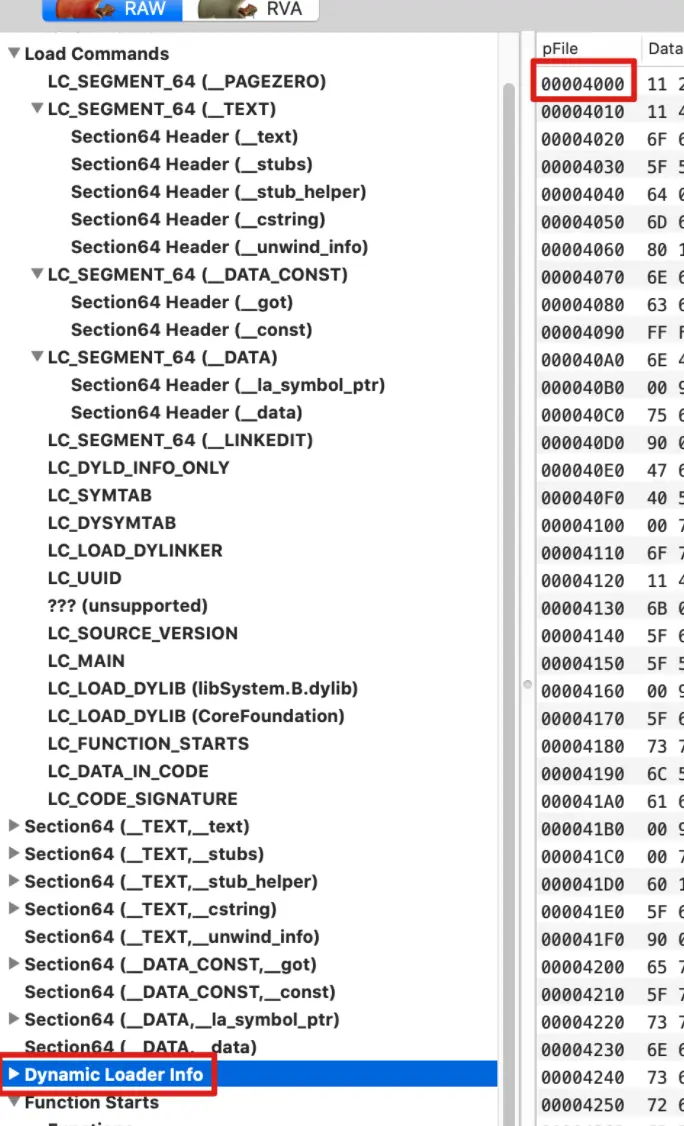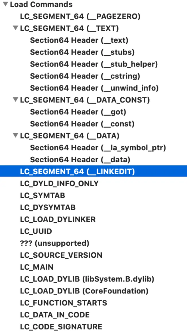 _PAGEZERO段不具有访问权限,用来处理空指针,其值为0;TEXT为代码段,_DATA/_DATA_CONST为可读写的数据段;_LINKEDIT链接段包含了一些符号表、间接符号表、rebase操作码、绑定操作码、导出符号、函数启动信息、数据表、代码签名、字符串表等数据,该加载命令下没有Section,需要配合LC_SYMTAB来解析symbol table和string table。_LINKEDIT加载命令信息中的文件偏移为0x4000(十进制16384)正好对应Dynamic Loader Info起始地址,文件大小为0x5840(十进制22592)=0x9840(0x9830+10)-0x4000,正好对应从Dynamic Loader Info到文件末尾的数据部分; -
