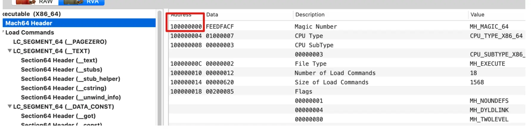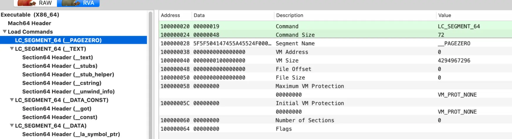 其中虚拟地址范围为0x0~0x100000000正好对应4GB空间,该文件的起始虚拟地址空间也是从0x100000000开始,即所有代码和数据都是被加载到4GB之后的地址。对应的文件内容大小为0,即在该文件中不占用实际空间,且具有不可读写不可执行权限,这样内核就可以识别到空指针或指针截断的错误的范围该地址空间的调用而抛出段异常,如EXC_BAD_ACCESS异常。