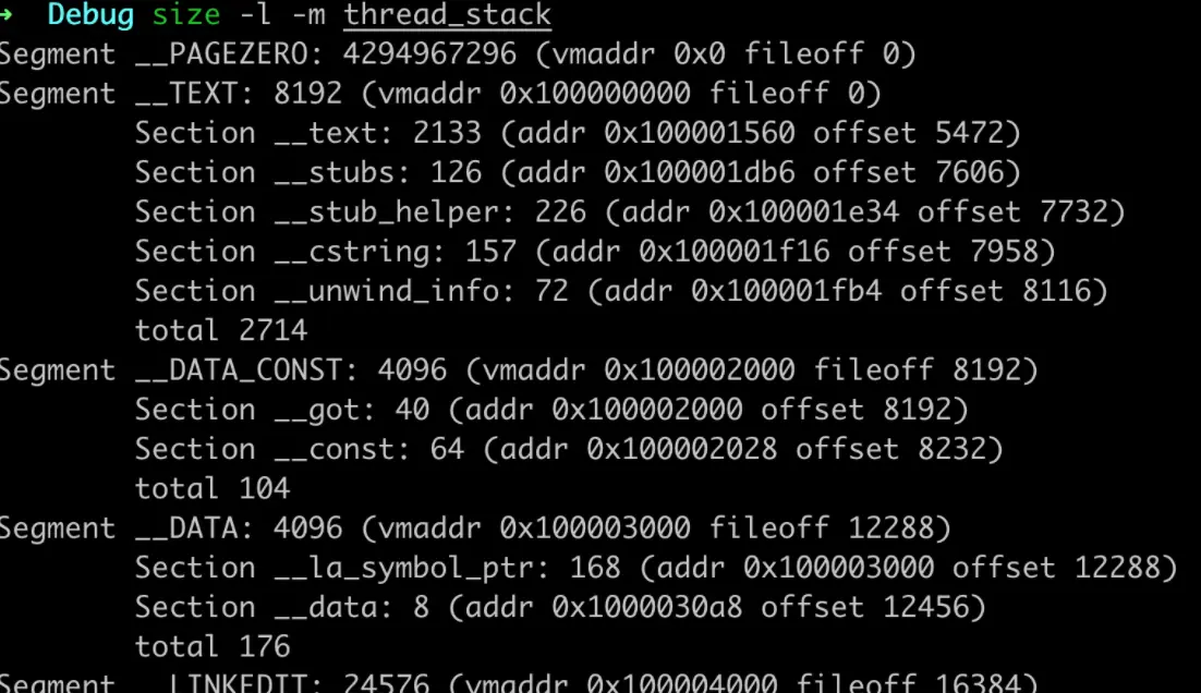 对于段的地址大小可通过size -l -m xxx查看,如下图:
