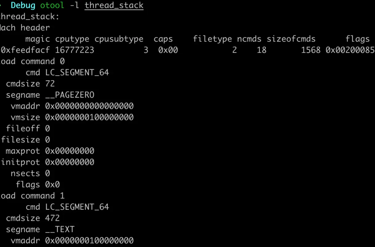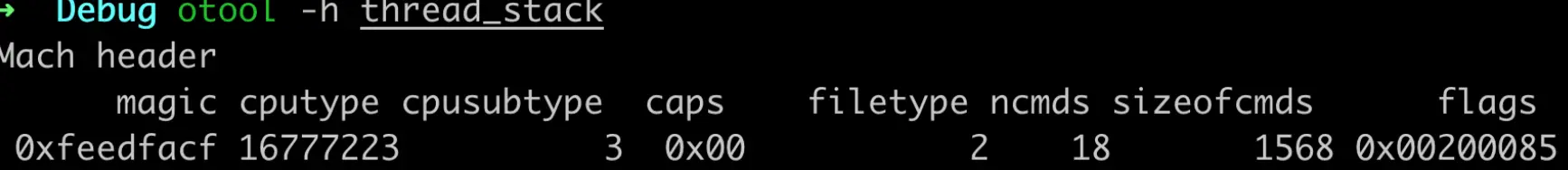 filetype,文件类型,如可执行文件、库文件、动态链接器、符号文件和调试信息等,其中MH_EXECUTE代表可执行文件,具体的文件类型定义如下:/* Constants for the filetype field of the mach_header */ #define MH_OBJECT 0x1 /* relocatable object file */ #define MH_EXECUTE 0x2 /* demand paged executable file */ #define MH_FVMLIB 0x3 /* fixed VM shared library file */ #define MH_CORE 0x4 /* core file */ #define MH_PRELOAD 0x5 /* preloaded executable file */ #define MH_DYLIB 0x6 /* dynamically bound shared library */ #define MH_DYLINKER 0x7 /* dynamic link editor */ #define MH_BUNDLE 0x8 /* dynamically bound bundle file */ #define MH_DYLIB_STUB 0x9 /* shared library stub for static */ #define MH_DSYM 0xa /* companion file with only debug */ #define MH_KEXT_BUNDLE 0xb /* x86_64 kexts */ -