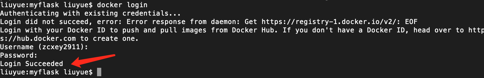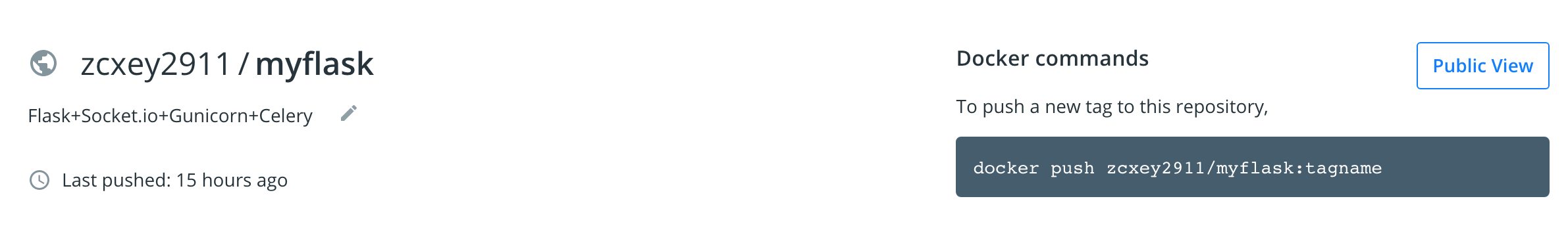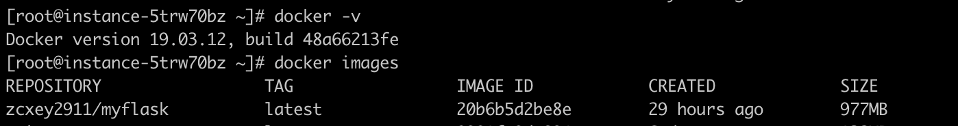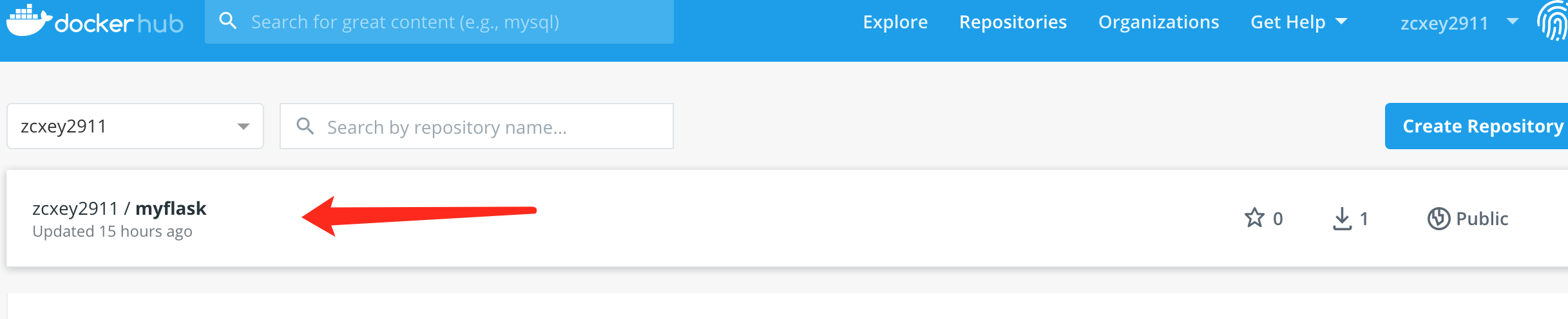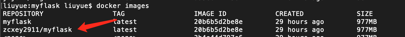 此时我们需要对本地的镜像重命名,这里重命名为zcxey2911/myflask。因为要与dockerhub上的仓库对应。如果名称不对应是无法将本地镜像push到线上仓库中。