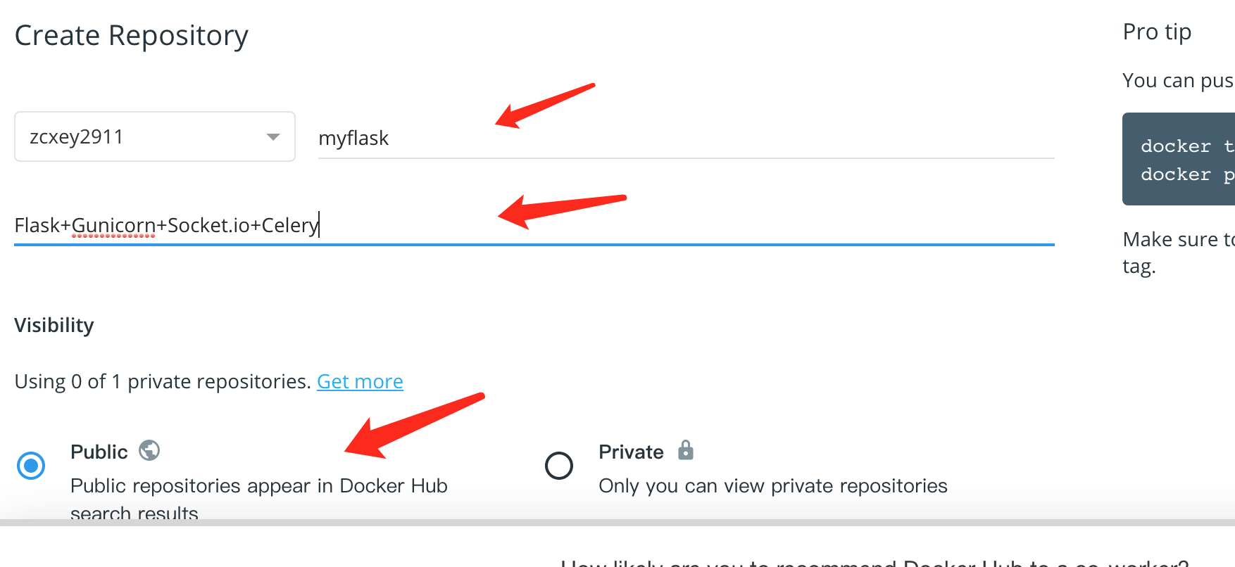 填写仓库信息具体为仓库名称、描述以及是否公开或者私有。
