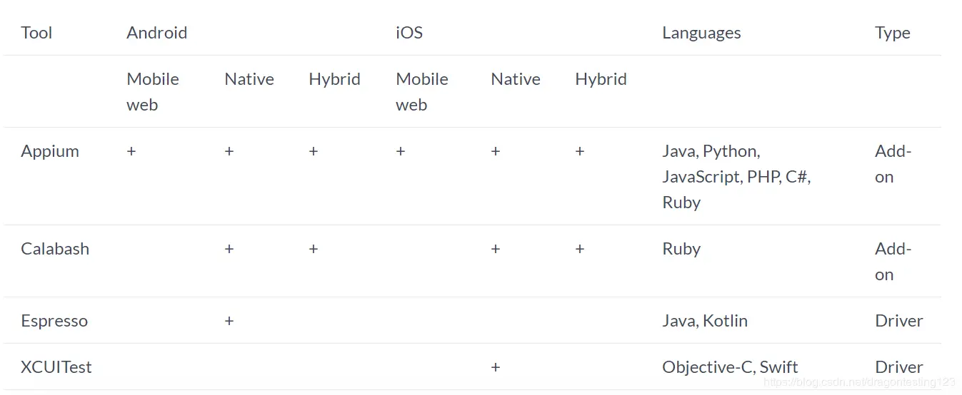 本机对象识别工具划分为两个大的分类:跨平台(像Appium,Calabash)和特定平台,进一步细分为安卓专用工具(像Espresso)和IOS专用工具(像XCUITest)。