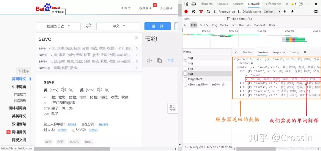 接下来右键点击检查,选择 Network 中的 XHR (向服务器发送的数据请求)。然后我们在输入框里输入 save 这个单词,我们可以看到一时间这里面多了几个 sug 标签,点开一看: