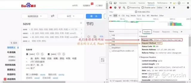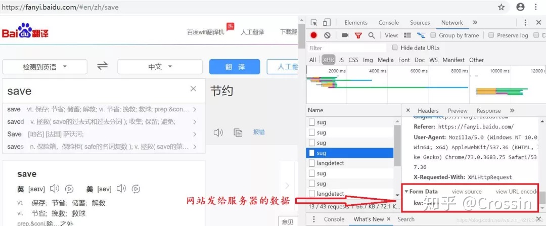 在 Form Data 中,我们看见表单是一个字典:{'kw': 'save'},这里 save 是我们自己输入的,也就是我们要查询的单词,因此我们使用 requests.post 来模拟这个请求: