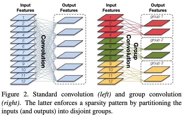 分组卷积能够有效地降低网络参数,对于稠密的网络结构而言,可以将卷积变为