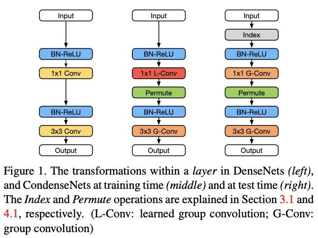 在训练后,需要去除剪枝的权重转换为常规的网络结构,这样不仅能够降低网络参数,还能保证在计算能耗有限的设备上高效运行。为此CondenseNet在发布时需要加入Index层,该层的原理如图3最右所示,根据剪枝后的剩余权重对输入特征进行重排,将可学习分组卷积的剩余权重转换成分组卷积,训练阶段到测试阶段的转换如图1。