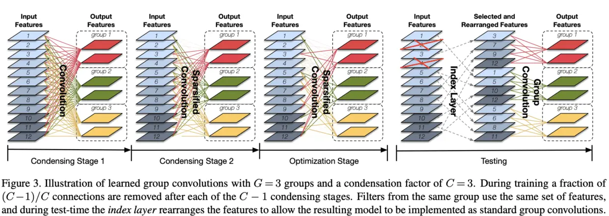 CondenseNet的剪枝在训练过程中进行,如图3所示,在每个condensing阶段,会剪除