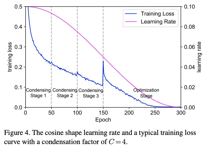训练使用cosine学习率退火,训练过程如图4所示,中间的损失突然上升是由于最后的condensing阶段后剪枝了一半的权重(最后的condensing阶段内仅权重)导致的,但从图中可以看出,训练很快就恢复了。