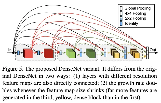 称为增长率。而论文发现越深的层实际更依赖较高维的特征,因此需要增强与当前层较近的特征连接,通过逐渐增加增长率来实现。设置增长率为
