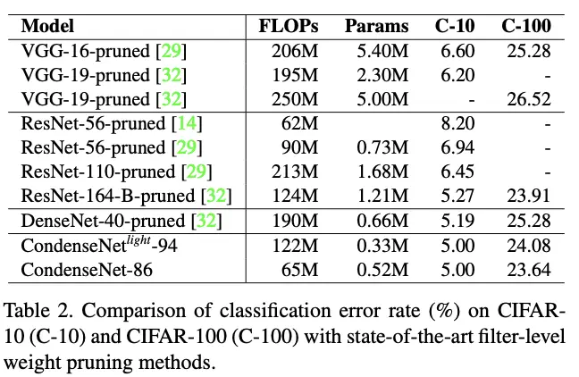 CIFAR-10和CIFAR-100上的剪枝SOTA网络性能对比。