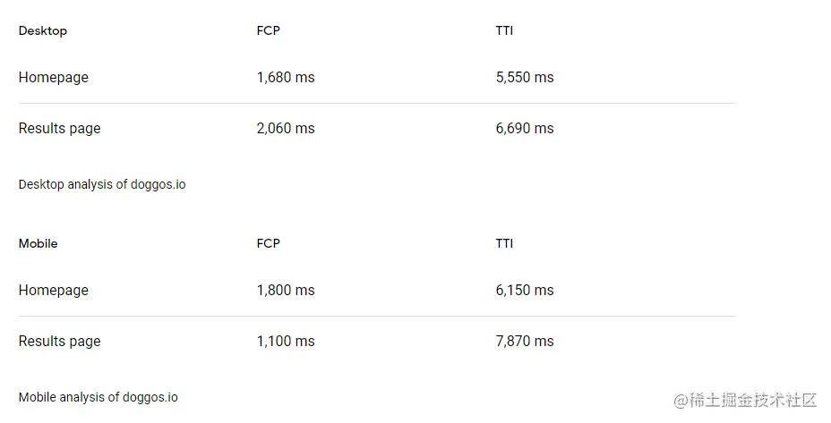 以一个高度专业化的搜索引擎为例,doggos.io,作为一个例子。狗狗.io目的是索引互联网上所有与狗有关的东西,它最重要的网页是主页和结果页。以下是在桌面和移动设备上测量的FCP和TTI数字。