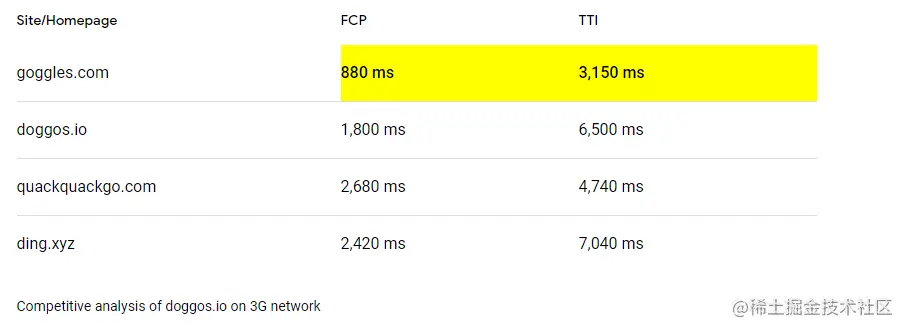为所有类似的网站创建一个包含FCP和TTI时间的图表,并突出显示其中最快的。像这样的图表可以让你更清楚地了解你的网站与竞争对手的表现。