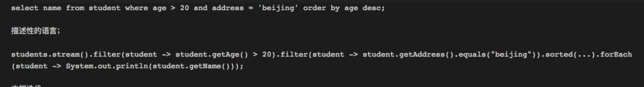 SQL语句是一种描述性的语言,只需要发送指令告诉底层需要做什么,而不关心底层是怎么实现的,而流其实也是一样的,只需要知道做什么,而不需要知道具体底层是怎么做的。