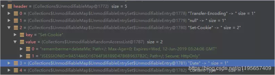 header 里有JSESSIONID,但是第二个打印里没哟JSESSIONID 调试结果和源码注解指出,getHeaderField : If called on a connection that sets the same header multiple times * with possibly different values, only the last value is returned. getHeaderFields 的返回值类型 Map<String,List> ,下面贴出这个map