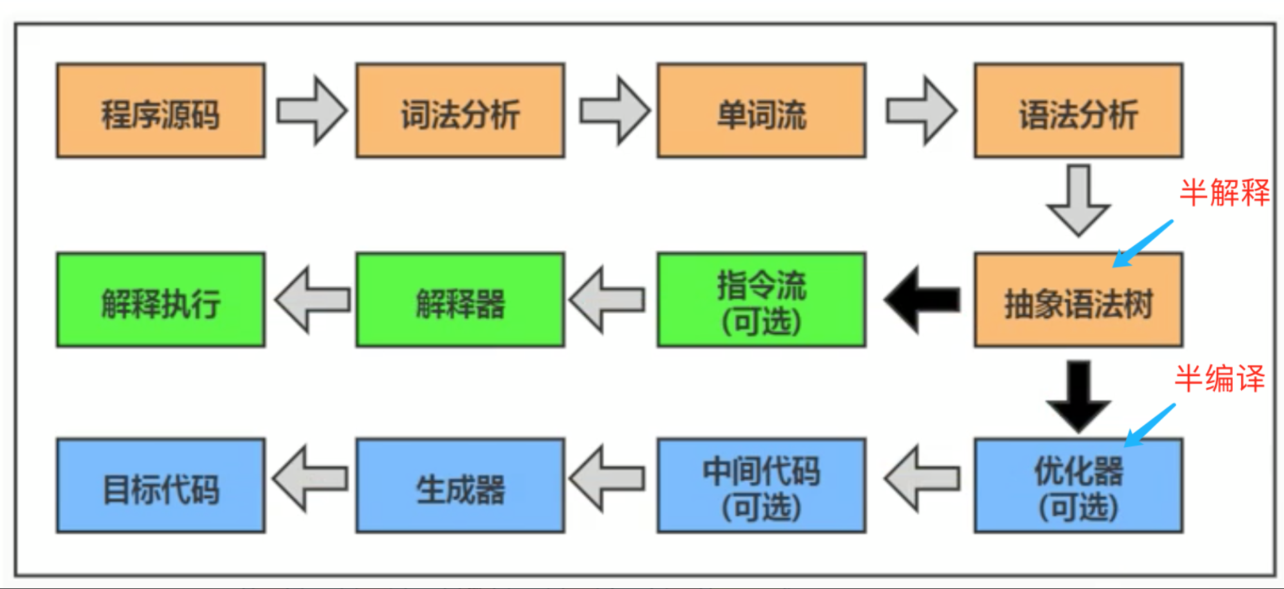 大部分的程序代码转换成物理机的目标代码或虚拟机能执行的指令集之前,都需要经过下面图中的各个步骤: