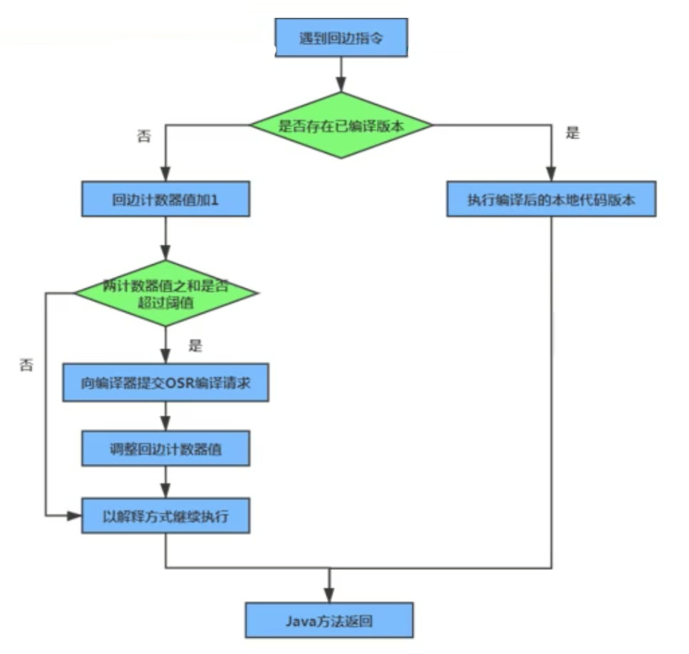 它的作用是统计一个方法中循环体代码执行的次数,在字节码中遇到控制流向后跳转的指令称为“回边” (Back Edge)。显然,建立回边计数器统计的目的就是为了触发OSR编译。