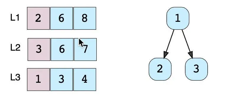 - 重复上面的步骤,取出堆顶元素加入到结果列表中,再把它的下一个元素加入到堆中。这里有两个3,可以随便选,但是要注意选了哪个就把哪个的下一个元素加到堆中,这个次序很重要。