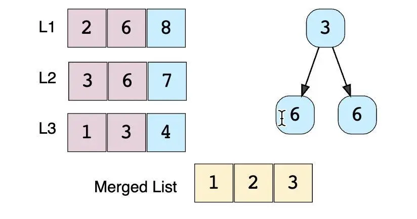 - 我们会取出位于堆顶的元素,加入到合并的列表中,然后把这个元素所在链表中的的下一个元素加入到堆中: