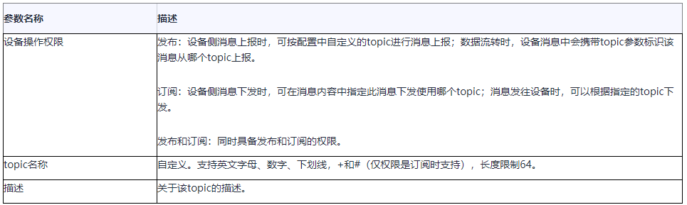 - 确保创建自定义Topic时,设备操作权限包含“订阅”功能,详细操作请参考设备操作权限。
