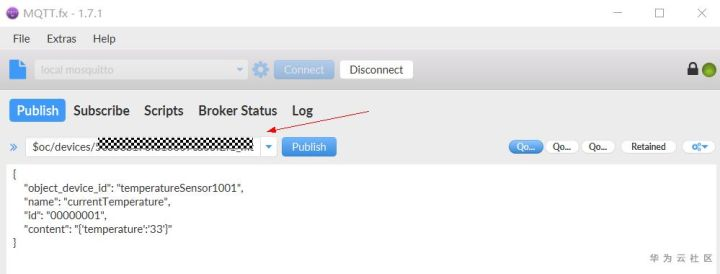 2、以MQTT.fx模拟器(请参考设备快速接入)为例,模拟设备上报自定义Topic消息。