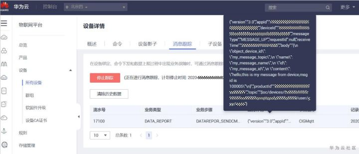 3、登录控制台,在设备详情消息跟踪页面,查看设备上报的自定义Topic消息。