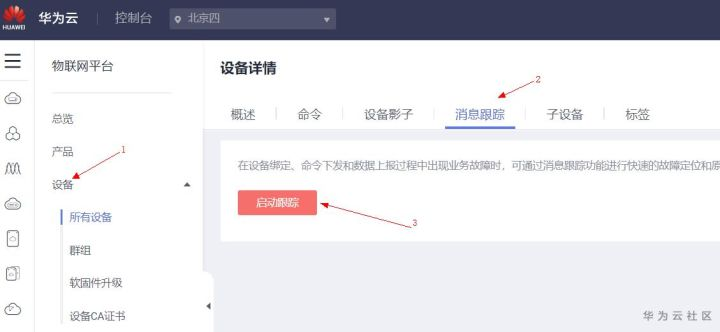 1、登录控制台,进入指定设备详情页,启动消息跟踪。