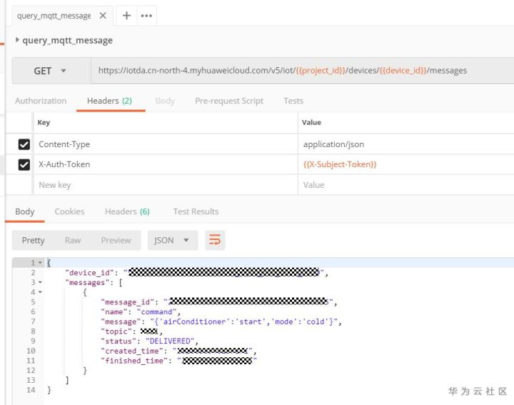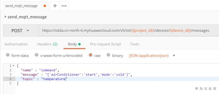 1、本文使用postman工具模拟应用侧调用下发设备消息接口,下发开启室内空调的命令。