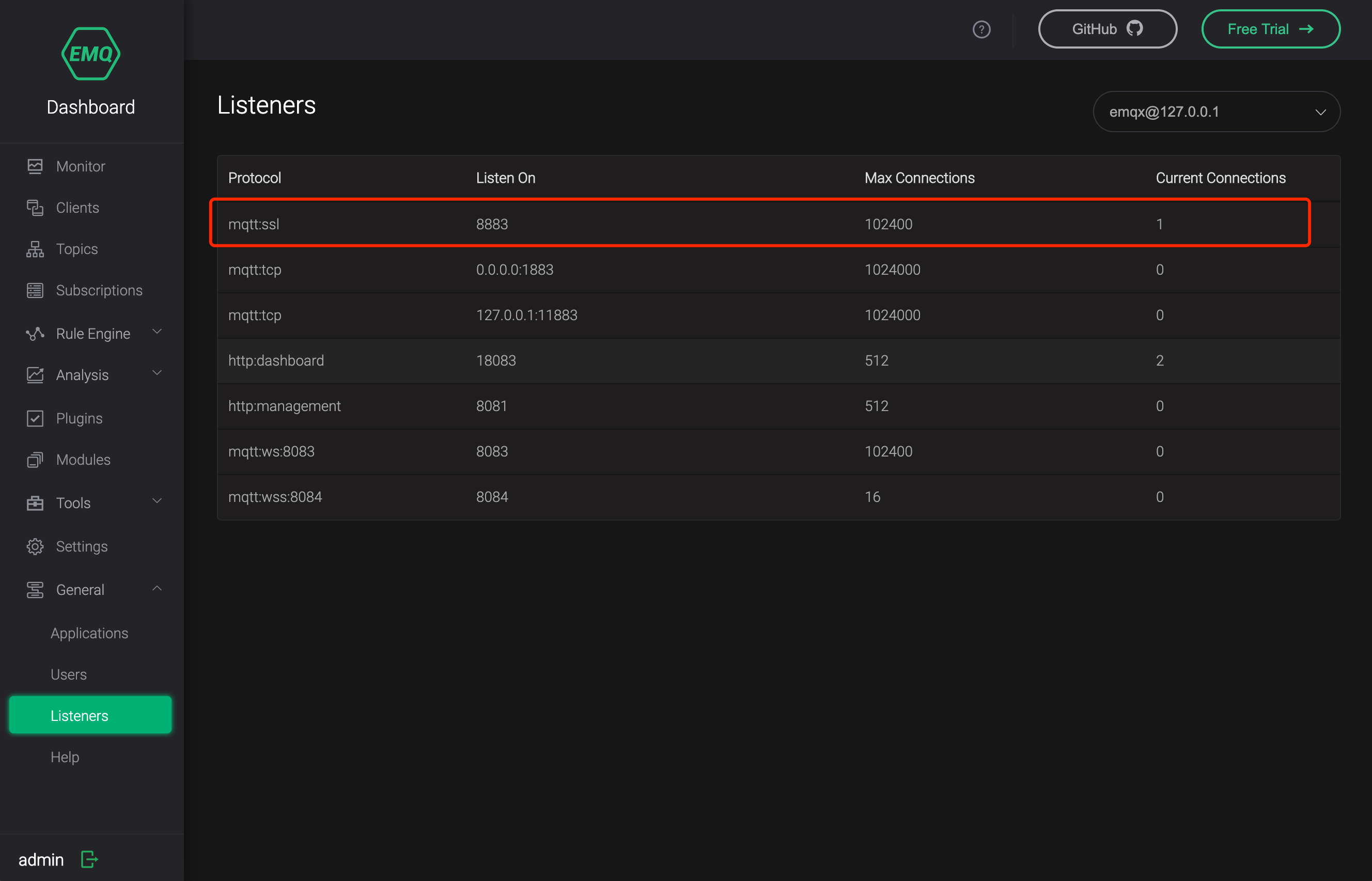 最后,打开 EMQ X 的 Dashboard 在 Listeners 页面可以看到在 8883 端口上有一个 mqtt:ssl 连接。