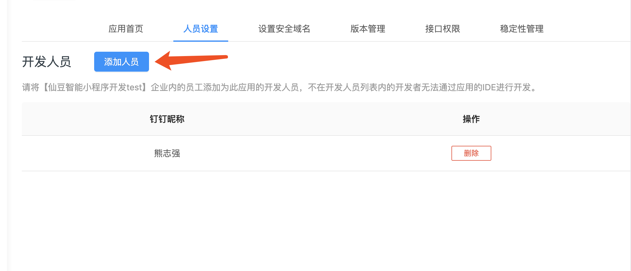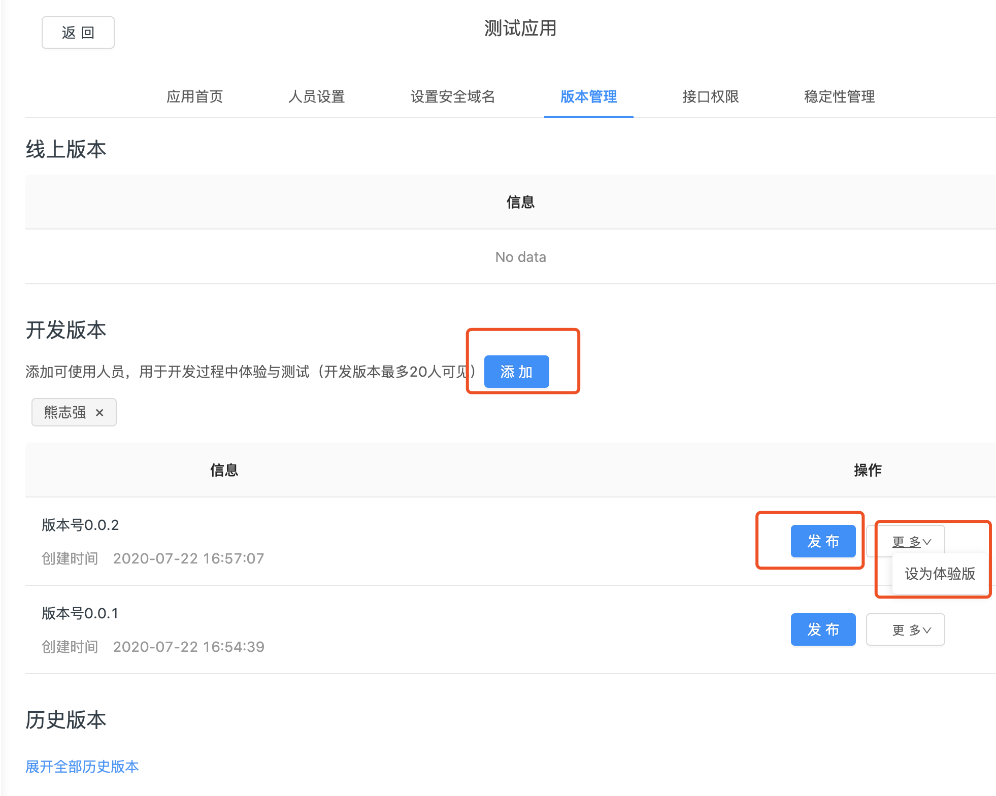 上传成功后在钉钉开发者后台可以看到上传的版本(添加体验人员、设置体验版本、发布线上版本)