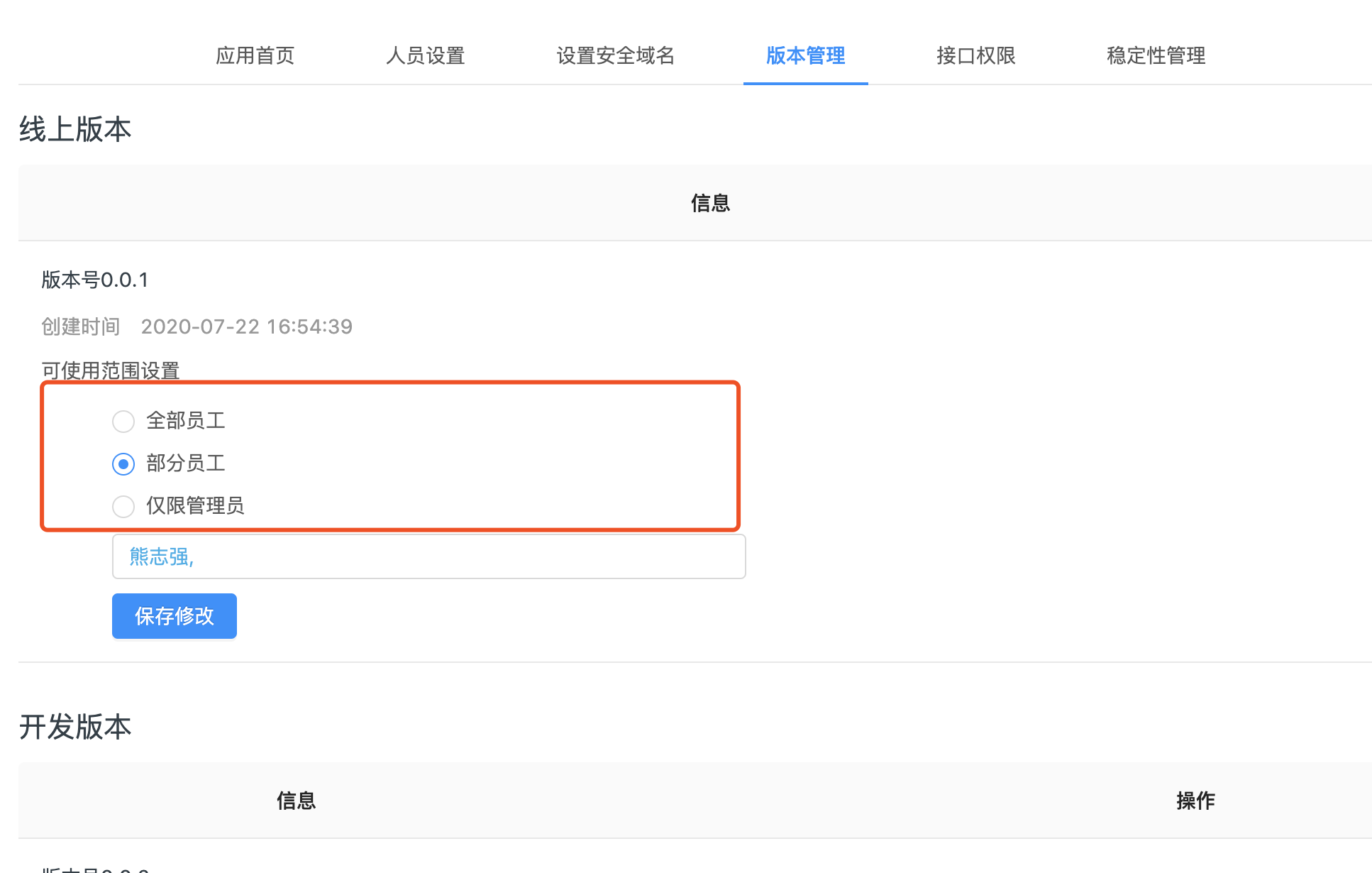 线上版本设置使用范围(选择部分员工的时候可以设置使用人员)