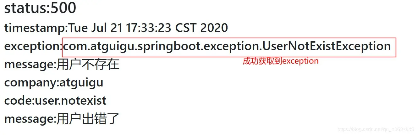 情况:已经在application.properties配置好了server.error.include-exception=true。自定义编写一个DefaultErrorAttributes子类——MyErrorAttributes,从而能实现自定制的错误页面中 能显示 自定义的错误数据。最后其他数据能成功展示在页面了,却唯独无法获取到${exception}
