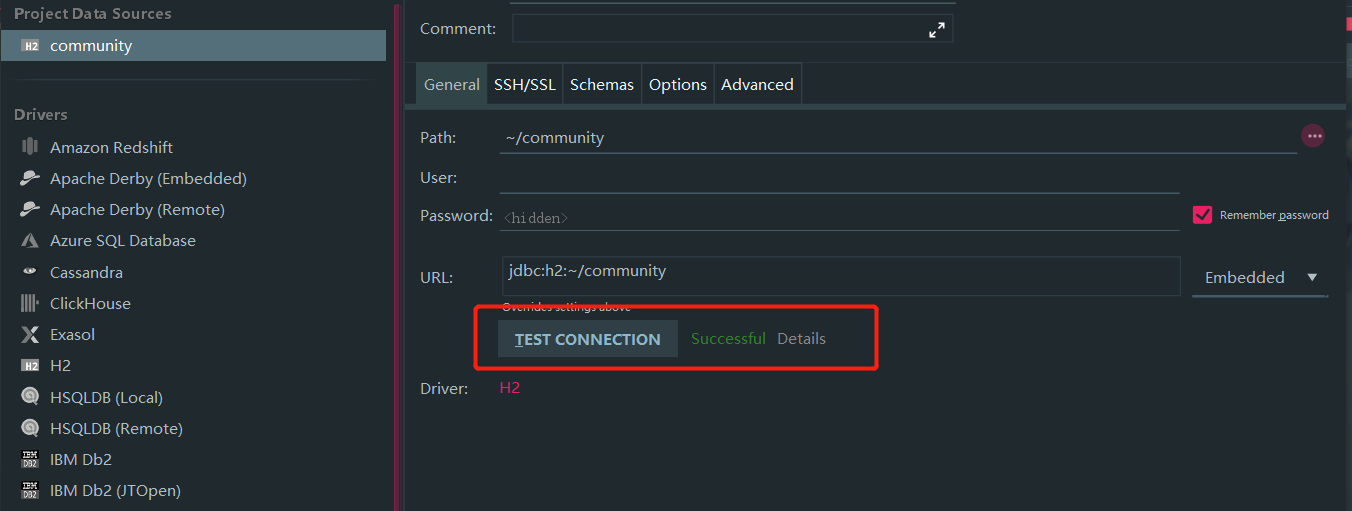 2.输入URL,~/你目前的项目名等价于数据库名,然后点击H2