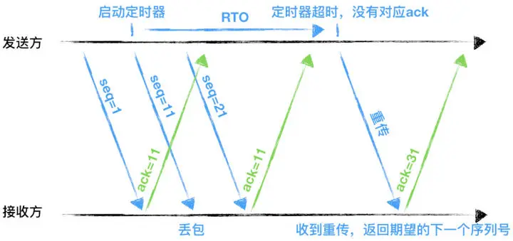 RTO:英文全称是 Retransmission TimeOut,即重传超时时间; RTO 是一个动态值,会根据网络的改变而改变。RTO 是根据给定连接的往返时间 RTT 计算出来的。 接收方返回的 ack 是希望收到的下一组包的序列号。