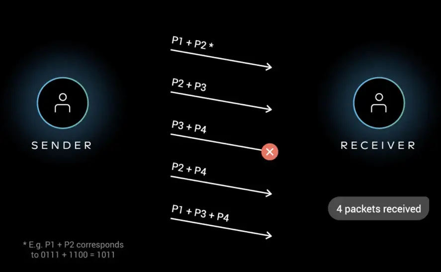 早期的 QUIC 版本存在一个丢包恢复机制,但后来由于增加带宽消耗和效果一般而废弃。FEC 中,QUIC 数据帧的数据混合原始数据和冗余数据,来确保无论到达接收端的 n 次传输内容是什么,接收端都能够恢复所有 n 个原始数据包。FEC 的实质就是异或。示意图: