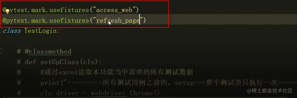 @pytest.mark.usefixtures("refresh_page") 可以写在测试用例前面,但是这个测试类下面每一个测试用例都用到了 fixture,大家的操作都是一样的,就没必要在每个函数前面都写上它。直接把它放在类前面就可以了。表示大家都用。