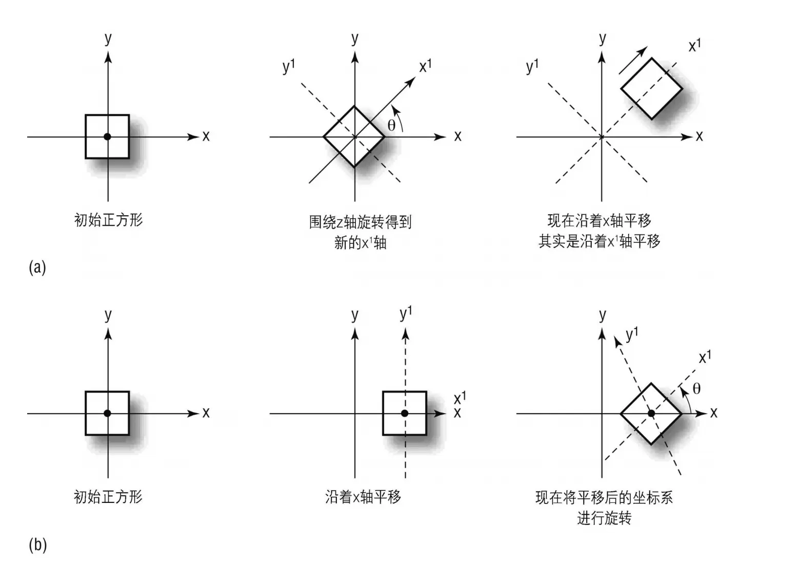 在图(b)中,同样的正方形首先沿着x 轴进行平移,然后再围绕z 轴进行旋转。