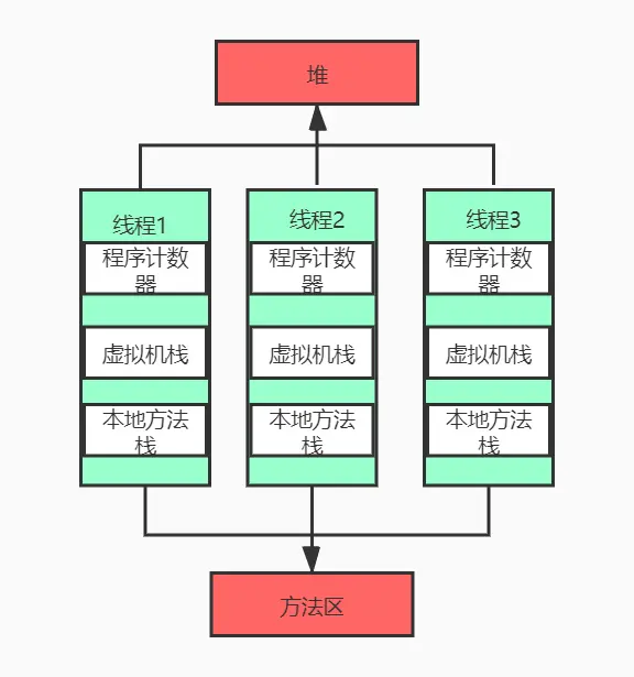 - 每个线程:独立包括程序计数器、栈、本地栈