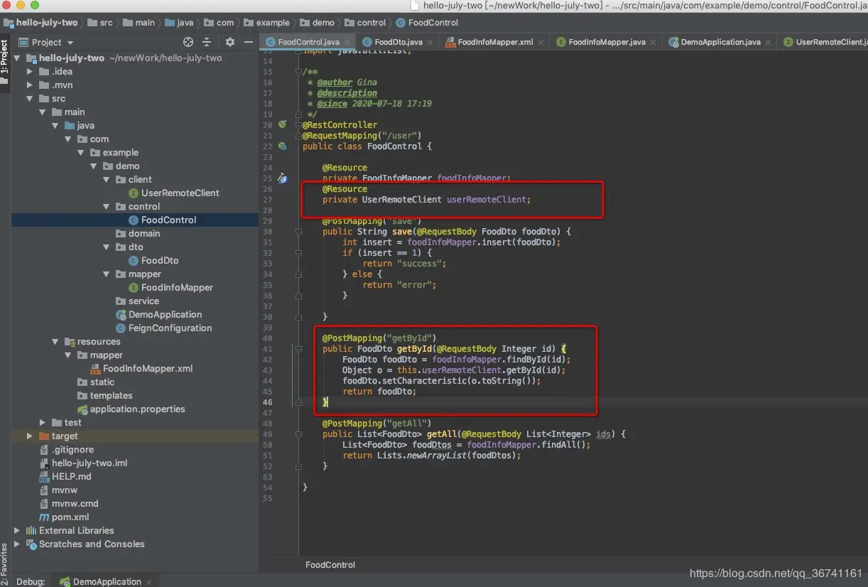 修改(hello-july-two)FoodControl实现,返回(hello-july-one)UserDto信息