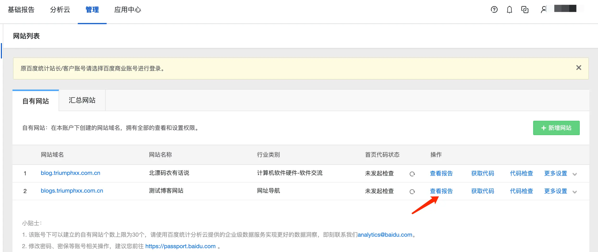 登录百度统计后台,点击管理,找到对应的网站域名,点击查看报告(采集的数据大约半个小时左右才会生效)。