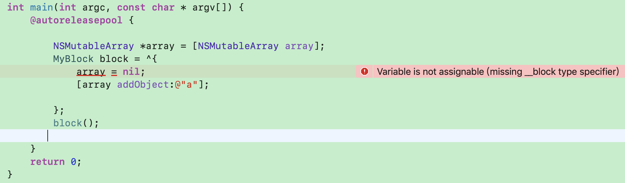 先说赋值nil报错,根据上面的分析,因为我们并没有用__block修饰array,block中不能修改auto对象,所以报错了。