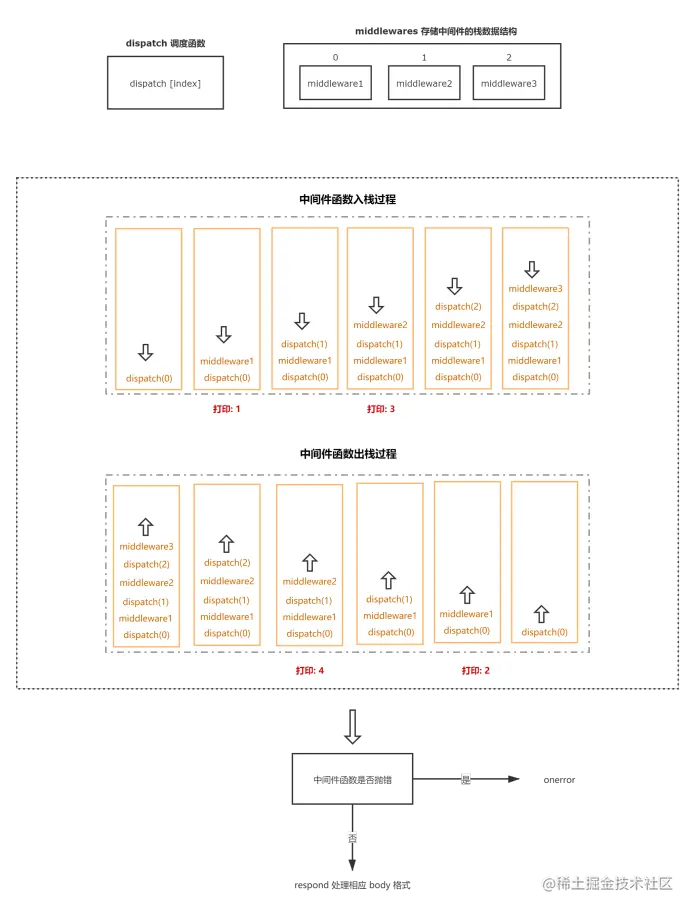 一个中间件函数执行完毕,相应的 dispatch 函数将执行权转交给上一个中间件函数的 **await next(),**执行该中间件函数 await 后续的代码。