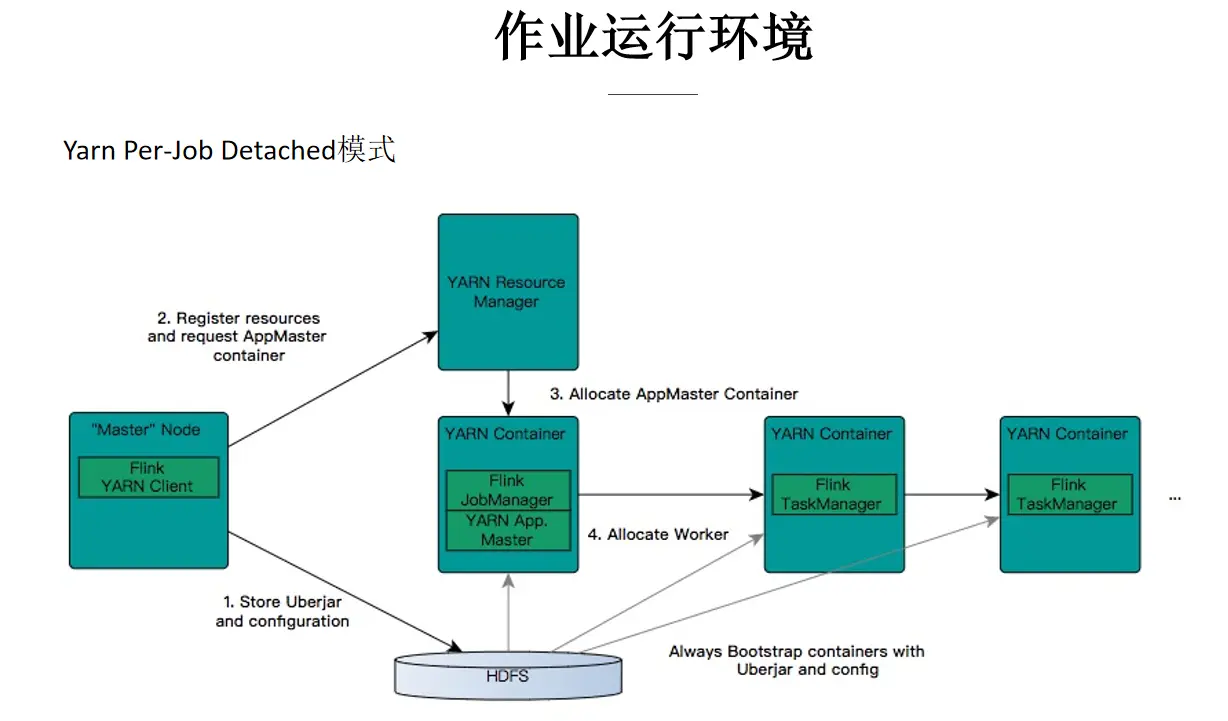- 第4步,在 JobManager 中根据作业的 JobGraph 生成 Execution Graph,ResourceManager 模块向 Yarn 的 ResourceManager 通信,申请 TaskManager 需要的 container 资源,这些 container 由 Yarn 的 NodeManger 负责拉起。每个 NodeManager 从 HDFS 上下载资源,启动 Container(TaskManager),并向 JobManager 注册;JobManger 会部署不同的 task 任务到各个 TaskManager 中执行。