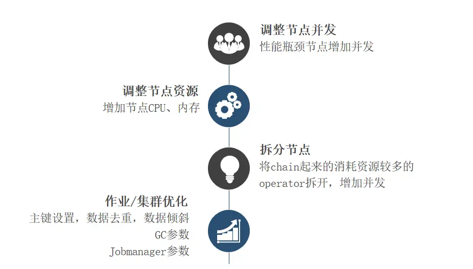 - 作业或集群优化,通过主键打散,数据去重,数据倾斜,GC 参数,Jobmanager 参数等方式调优。