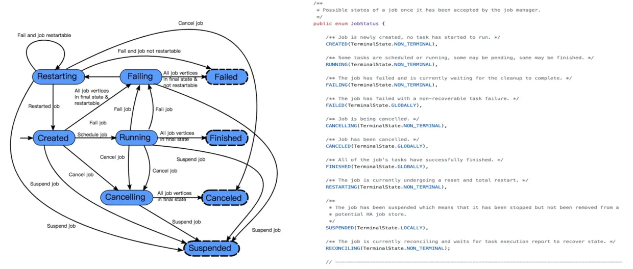 这里需要注意的是 reconciling 的状态,这个状态表示 yarn 中 AppMaster 重新启动,恢复其中的 JobManager 模块,这个作业会从 created 进入到 reconciling 的状态,等待其他 Taskmanager 汇报,恢复 JobManager 的 failover,然后从 reconciling 再到正常 running。
